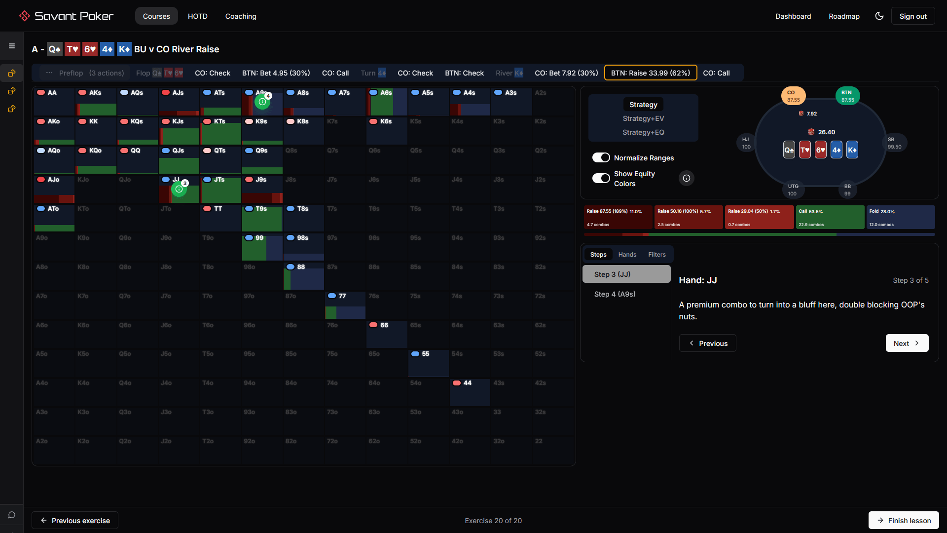 As you can see, it contains many unintuitive hands like JJ and A9. And it’s not fully clear that these are the best bluff-raises in-game either, as villain’s real-life calls/folds will differ from solver’s.