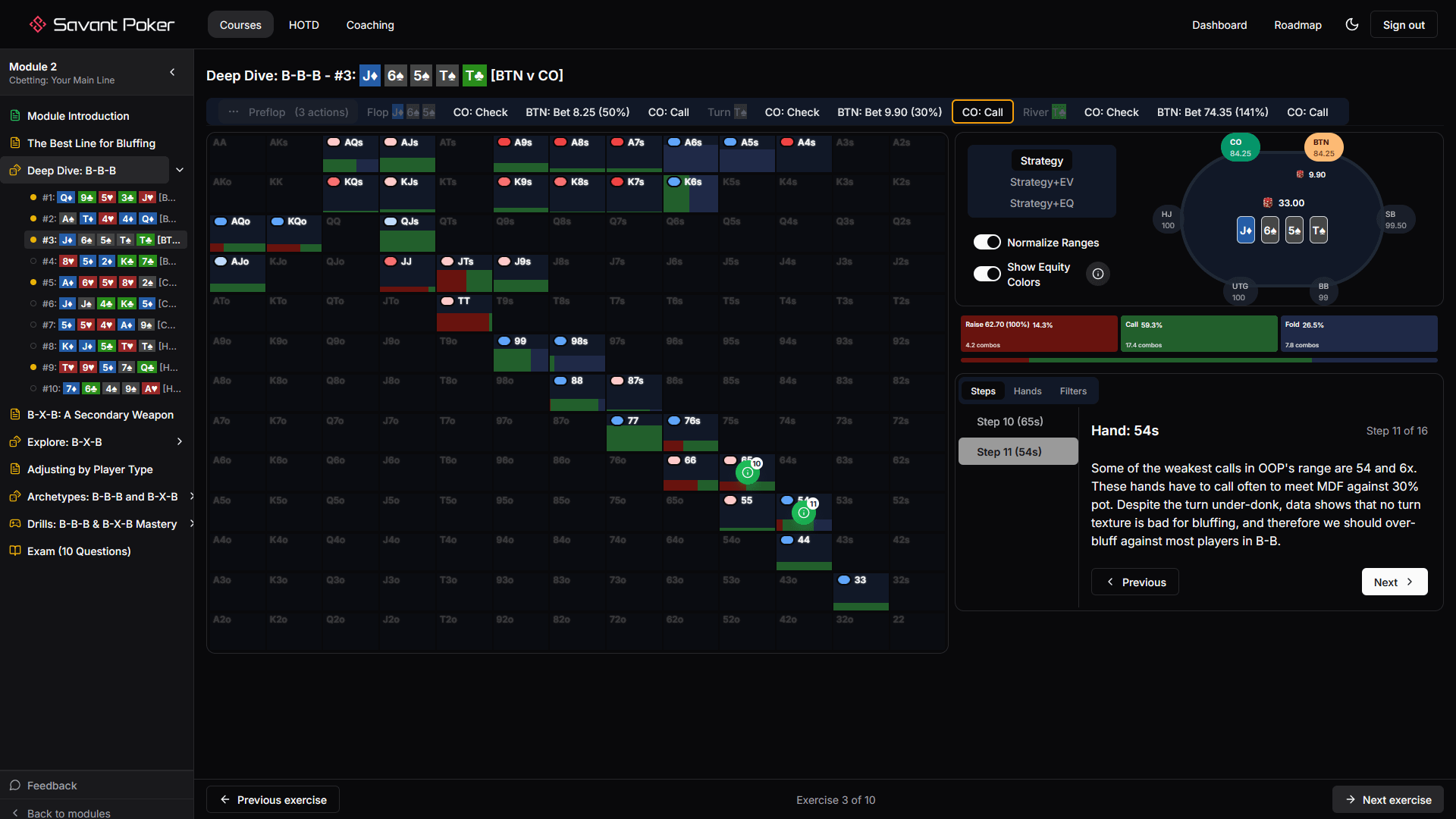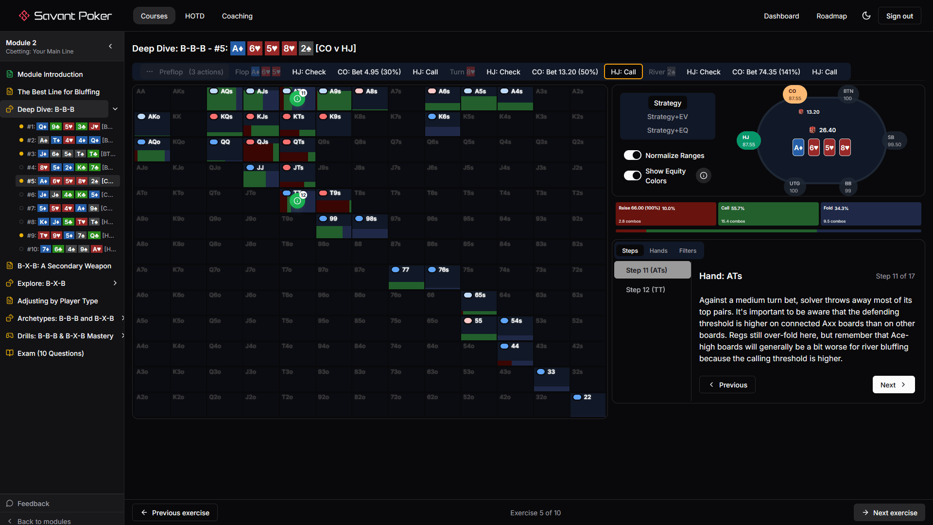 For example, consider HJ’s calling strategy against CO on A♦ 6♥ 5♥ 8♥. In this example, CO bet small (30%) on the flop and medium (50%) on the turn: